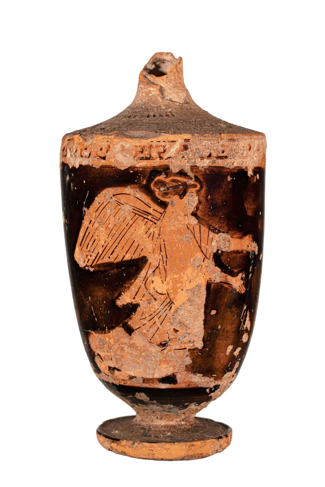 Lekythos attica a figure rosse con immagine di donna (?) in lunga veste e alata in marcia verso sinistra a braccia tese; fascia a meandro nero all'attacco della spalla, false baccellature in nero sulla spalla (assai poco leggibili).