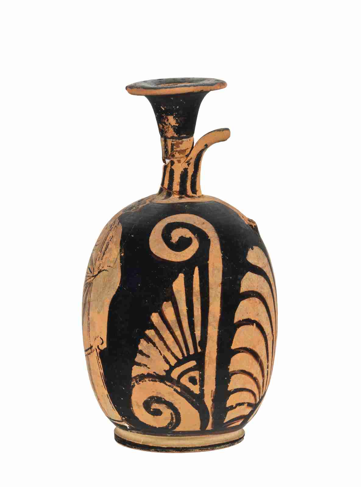 Buono; Ricomposta da 5 frammenti; il collo è spezzato in due punti (una frattura è antica i due frammenti non coincidono perfettamente a causa della consunzione), l'ansa riattaccata e mancante della sua parte centrale. Sul lato A è presente una sbeccatura sotto il labbro. La vernice nera è complessivamente ben conservata, pur presentando scalfiture, in particolare sul lato B, sull'ansa e sul collo; sull'orlo risulta del tutto scomparsa. La lekythos presentava sovradipinture bianche, ora quasi del tutto sbiadite. L'attuale numero di inventario gene-rale è scritto sotto il piede del vaso.