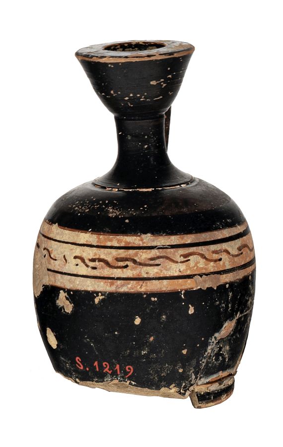 Lekythos miniaturistica a corpo globulare attica con tre fasce a risparmio e nella centrale decorazione a meandro