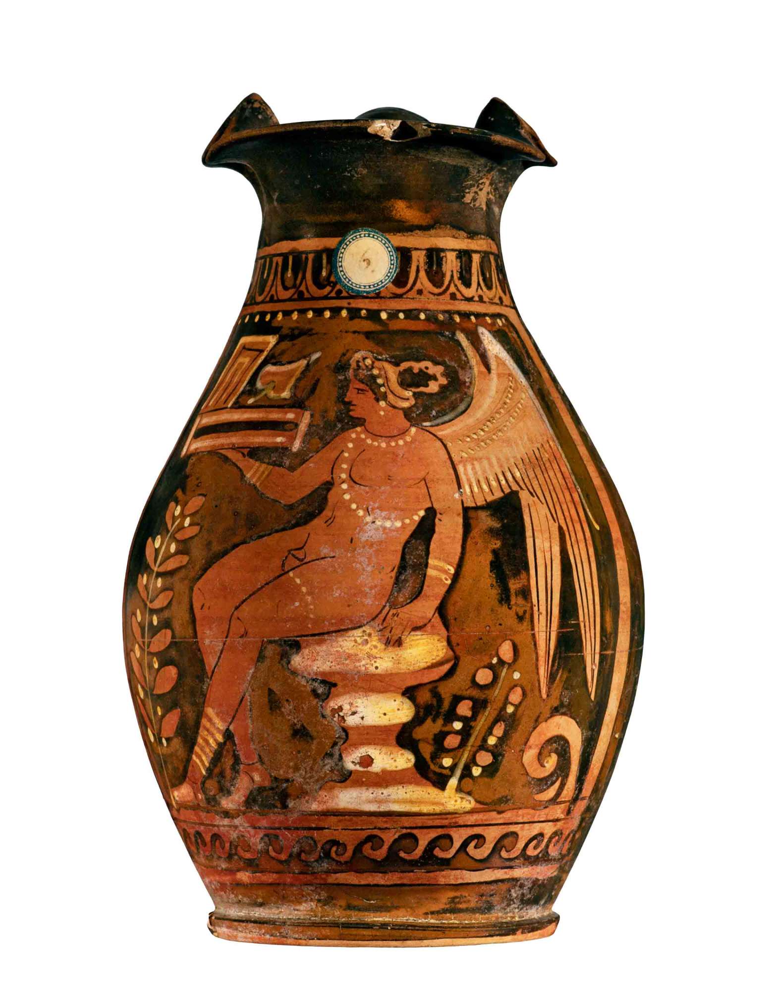La Bellinato attribuisce l'oinochoe al Pittore di Menzies.