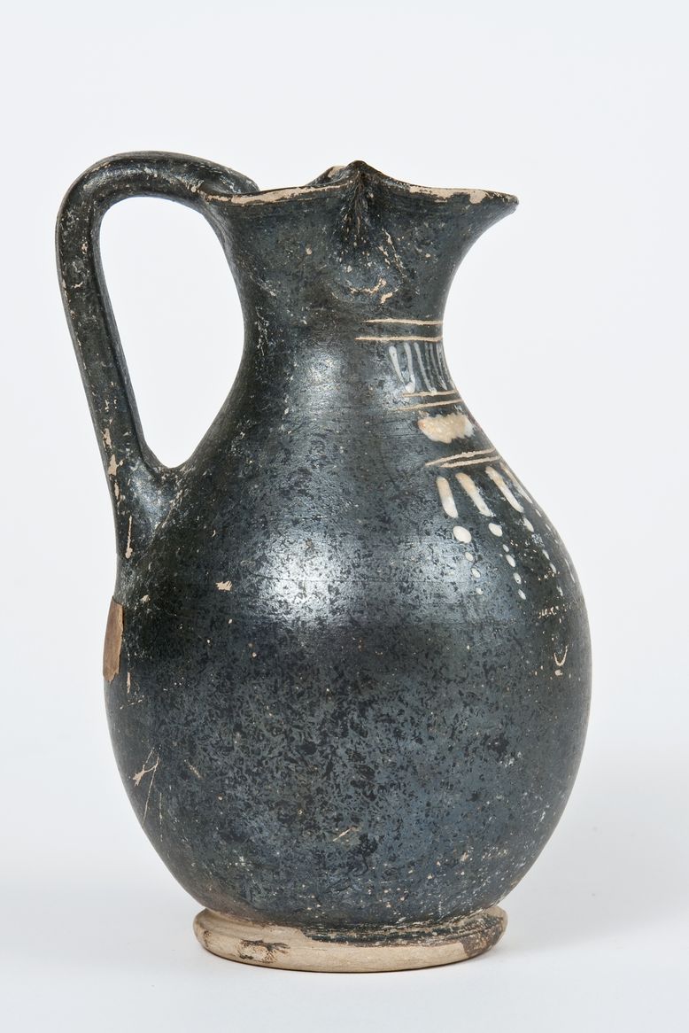 Oinochoe a vernice nera, tendente al grigio, con sovraddipinture in bianco, giallo, rosso amaranto ed incisioni. Orlo trilobato, collo a profilo concavo, corpo ovoidale, ansa a nastro obliqua, desinente alla sommità, nel punto d’attacco all’orlo, in una protuberanza, stilizzazione di una protome, basso piede ad anello. Lungo il collo: tra tre coppie di linee incise, ovuli dipinti in bianco e tremuli giallo-rossi; pendenti lunghi campiti in giallo su base bianca.