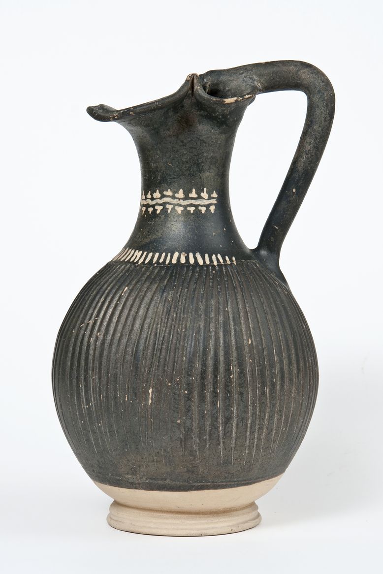 Oinochoe a vernice nera, a tratti tendente all’olivastro, con sovraddipinture in bianco e giallo. Labbro modanato, orlo estroflesso e trilobato, collo a profilo concavo, corpo globulare con larghe strigilature espanso, ansa a bastoncello obliqua, desinente alla sommità, nel punto d’attacco all’orlo, in una protome leonina, piede ad anello modanato. Sul collo: ramo ondulato di edera con piccole foglie, sovraddipinto in bianco crema; sulla spalla bastoncelli.