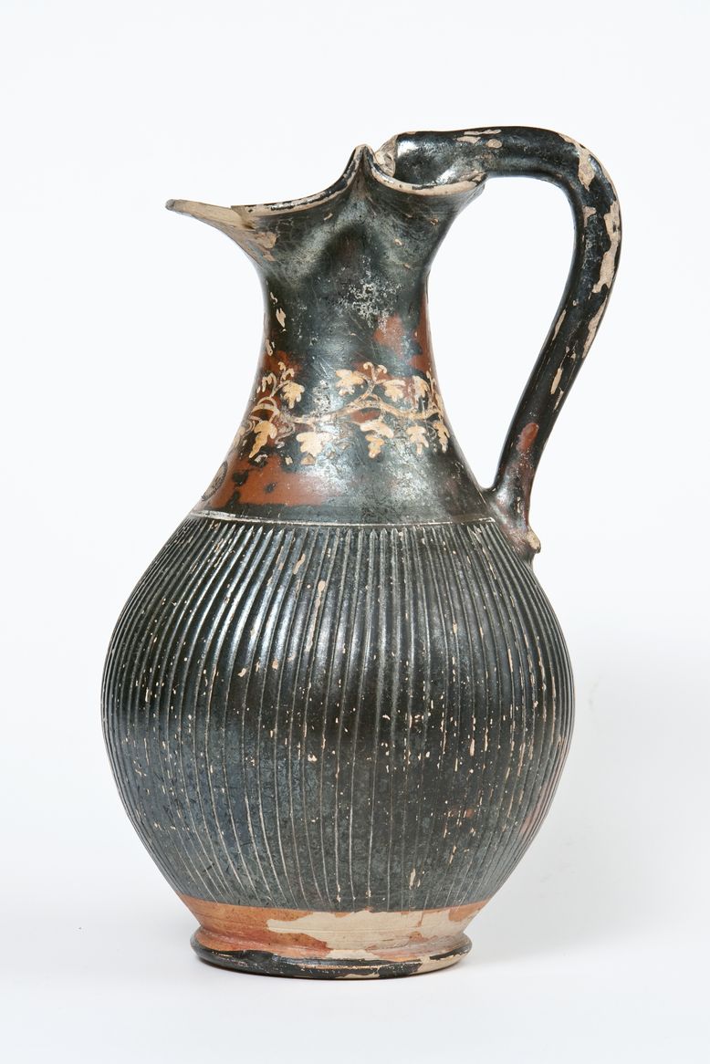 Oinochoe a vernice nera, tendente al rosso, con sovraddipinture in bianco e giallo. Orlo estroflesso e trilobato, collo a profilo concavo, corpo globulare strigilato, ansa a bastoncello leggermente obliqua e desinente alla sommità. nel punto d’attacco all’orlo, in una protome leonina, piede ad anello. Sul collo: tralcio di vite in giallo. Una linea dipinta in bianco, inquadra superiormente il corpo strigilato. Tracce di sovraddipintura sono presenti sulla protome leonina.