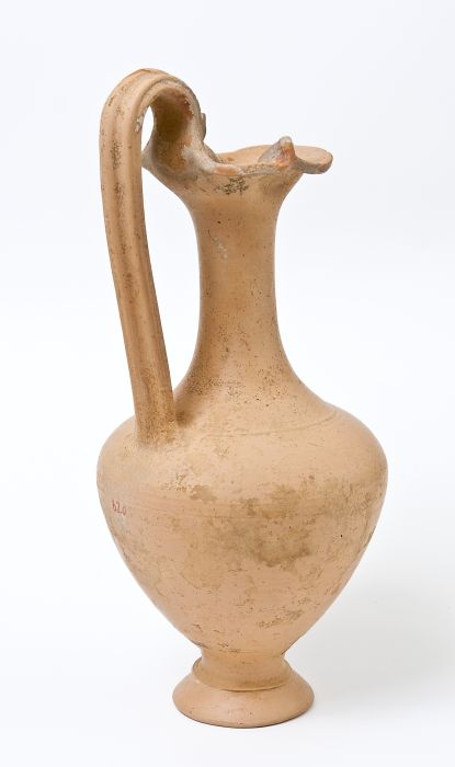 Oinochoe trilobata. Lungo collo leggermente svasato, corpo ovoidale, spalla a profilo convesso, alta ansa a nastro costolata, sormontante, impostata tra la bocca e la spalla; piede a echino modanato. Tracce di vernice rossa in corrispondenza dell’orlo e dell’ansa.