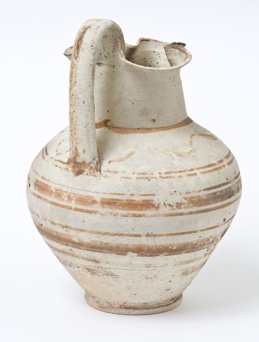 Oinochoe trilobata decorata a fasce si produzione peuceta. Collo corto, spalla carenata, corpo ovoidale, ansa a nastro sormontante impostata dalla bocca al di sotto della spalla, piede a disco. Decorazione monocroma in bruno: sul corpo, coppie di fasce sottili in bruno, orizzontali e parallele, tra cui si inserisce una fascia più larga marrone. Fascia sul collarino alla base del collo; coppia di grosse virgole in corrispondenza degli incavi del labbro che presenta l’orlo verniciato. Ansa e piede verniciati.