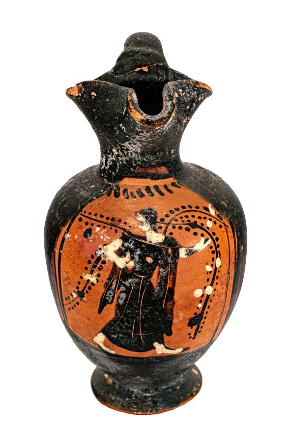 Oinochoe miniaturistica a figure nere con colore aggiunto e graffito. Menade in danza con crotali tra tralci di vite.