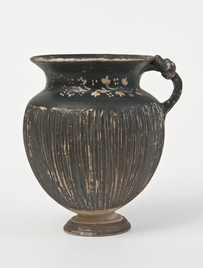 Boccale a corpo strigilato e ansa con nodo bifido a vernice nera sovraddipinta