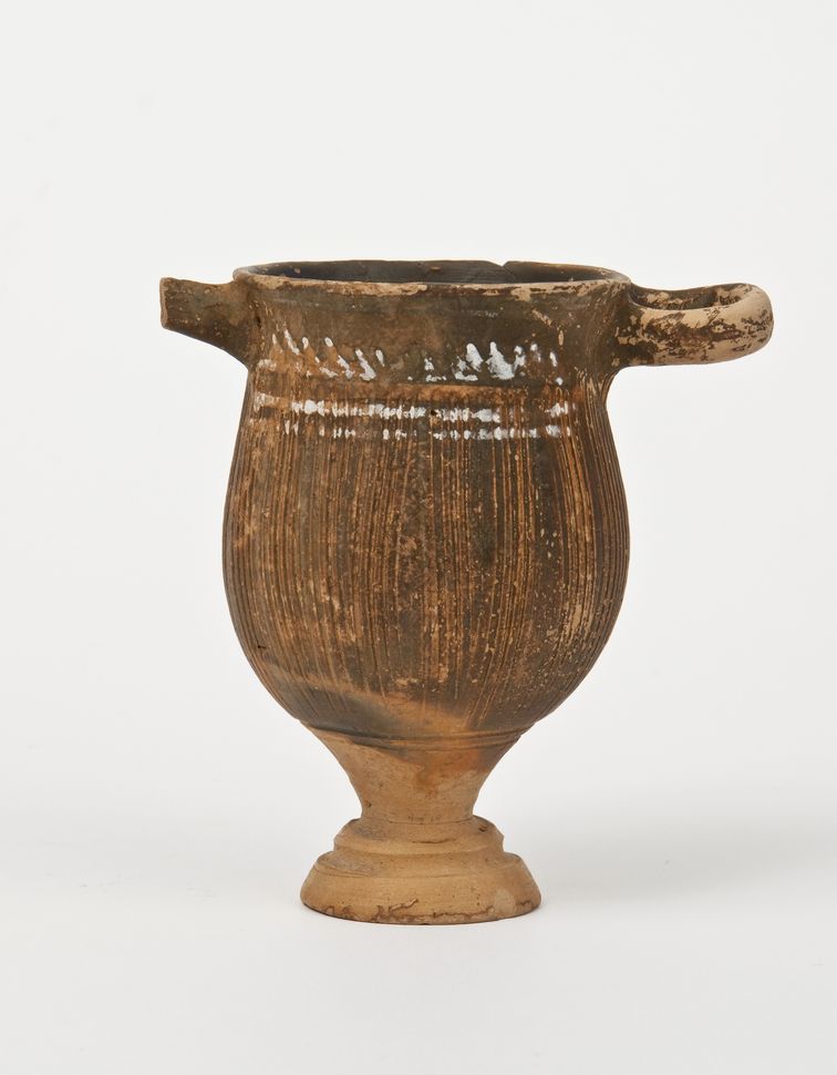 Skyphos su stelo a vernice nera con sovraddipinture in bianco e rosso amaranto. Orlo leggermente estroflesso, corpo ovoidale strigilato, fortemente rastremato verso il basso, anse a bastoncello, impostate orizzontalmente sotto l'orlo, stelo, piede troncoconico modanato. Lato A: è possibile leggere le sovraddipinture che sotto l'orlo costituiscono il motivo dell'onda tipo 4 (Redavid 2010, 149 fig. 40, 16, 153), su fascia in rosso amaranto e coppia di linee in bianco. Lato B: Si presume che ci sia stata la stessa decorazione del lato A, viste le tracce rimaste dell'onda e della coppia di linee alla base di essa. Risparmiati una fascia irregolare alla base del corpo, lo stelo ed il fondo del piede.