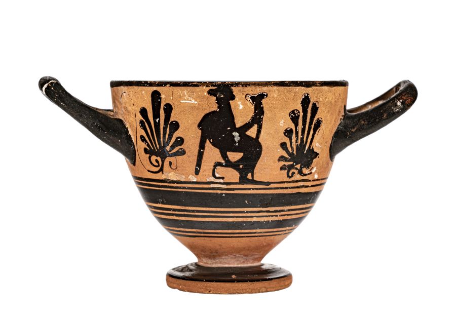Cup-skyphos attica a figure nere. Lato A e B: tra due palmette allungate su volute, sta il dio Dioniso barbato con lungo chitone, seduto su diphros mentre regge un rhyton.