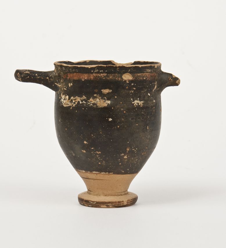 Skyphos a vernice nera, tendente al rosso sul lato B, con sovraddipinture in bianco, giallo e rosso. Orlo leggermente estroflesso, corpo rastremato verso il basso, anse a bastoncello, impostate orizzontalmente sotto l'orlo e ad andamento quadrangolare, basso piede a tromba con incavo centrale. Ciò che rimane della decorazione è una fascia in rosso amaranto ed una linea, presumibilmente, in giallo su base bianca. Sembrano inoltre leggersi le impronte in negativo lasciate dai pigmenti del motivo decorativo ad onda.