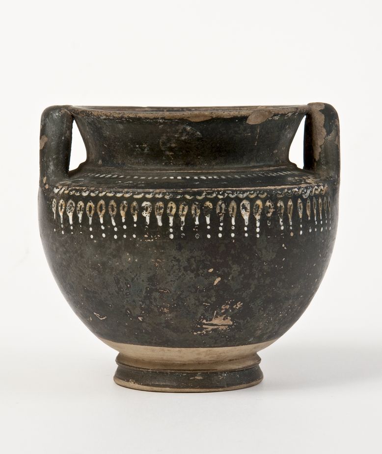 Stamnos a vernice nera, a tratti tendente al grigio, con sovraddipinture in bianco e giallo. Orlo estroflesso, corpo emisferico, anse verticali a maniglia a nastro spesso, impostate sulla spalla e aderenti all'orlo alla sommità, basso elemento di raccordo, piede troncoconico modanato. Lato A: sul collo, bottone centrale seguito, alla base, da una fila di punti; sulla spalla onda destrosa e serie di "S" inclinate in giallo su base bianca. Sulla fascia iniziale del corpo pendenti lunghi non campiti su fila di punti, in giallo su base bianca. Lato B: alla base del collo fila di bastoncelli brevi, seguiti sulla spalla da bastoncelli lunghi, entrambi in giallo su base bianca.