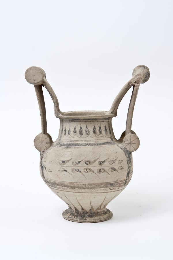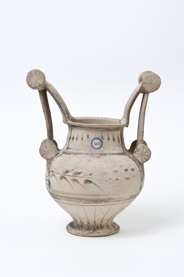 Trozzella in ceramica messapica. Orlo estroflesso e appiattito, basso collo troncoconico, a profilo leggermente convesso, corpo globoso rastremato verso il basso, con anse verticali sormontanti, impostate sull’orlo e sulla spalla, provviste di doppia coppia di dischi (“trozze”), di cui quelli superiori sono di maggiori dimensioni; basso piede a disco. Decorazione monocroma in nero su fondo naturale di argilla; su entrambi i lati, pannelli sul collo e sulla spalla inquadrati da fasce parallele, in cui campeggiano tralci d’edera stilizzati; sull’orlo, tratti; nella parte inferiore del vaso, raggiera di petali.