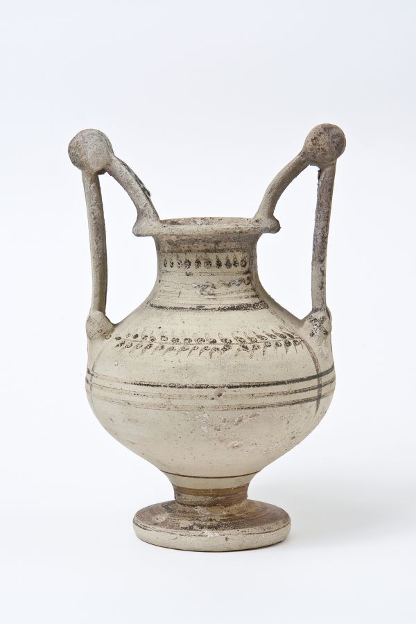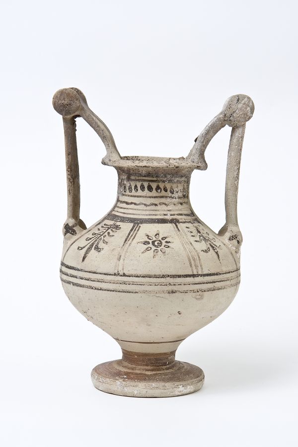 Trozzella in ceramica messapica. Orlo estroflesso e appiattito, alto collo cilindrico, a profilo leggermente concavo, corpo globoso, con anse verticali sormontanti, impostate sull’orlo e sulla spalla, provviste di doppia coppia di dischi (“trozze”), di cui quelli superiori sono di maggiori dimensioni; piede a disco, unito al corpo mediante un piccolo fusto. Decorazione monocroma in bruno su fondo naturale di argilla, con piede dipinto; risparmiata la costa laterale del piede; sul collo, linee orizzontali diritte con motivo a pendenti nella fascia superiore e a onde correnti in quella inferiore; sulla spalla, una serie di pannelli definiti da linee parallele, in cui su un lato campeggiano due palmette laterali e un sole (o rosetta) al centro, mentre sull’altro un ramo di ulivo. All’altezza del ventre, una fascia a tre linee parallele; sul fusto del piede, fasce e una linea; sull’orlo, tratti; sui dischi linee radiali.