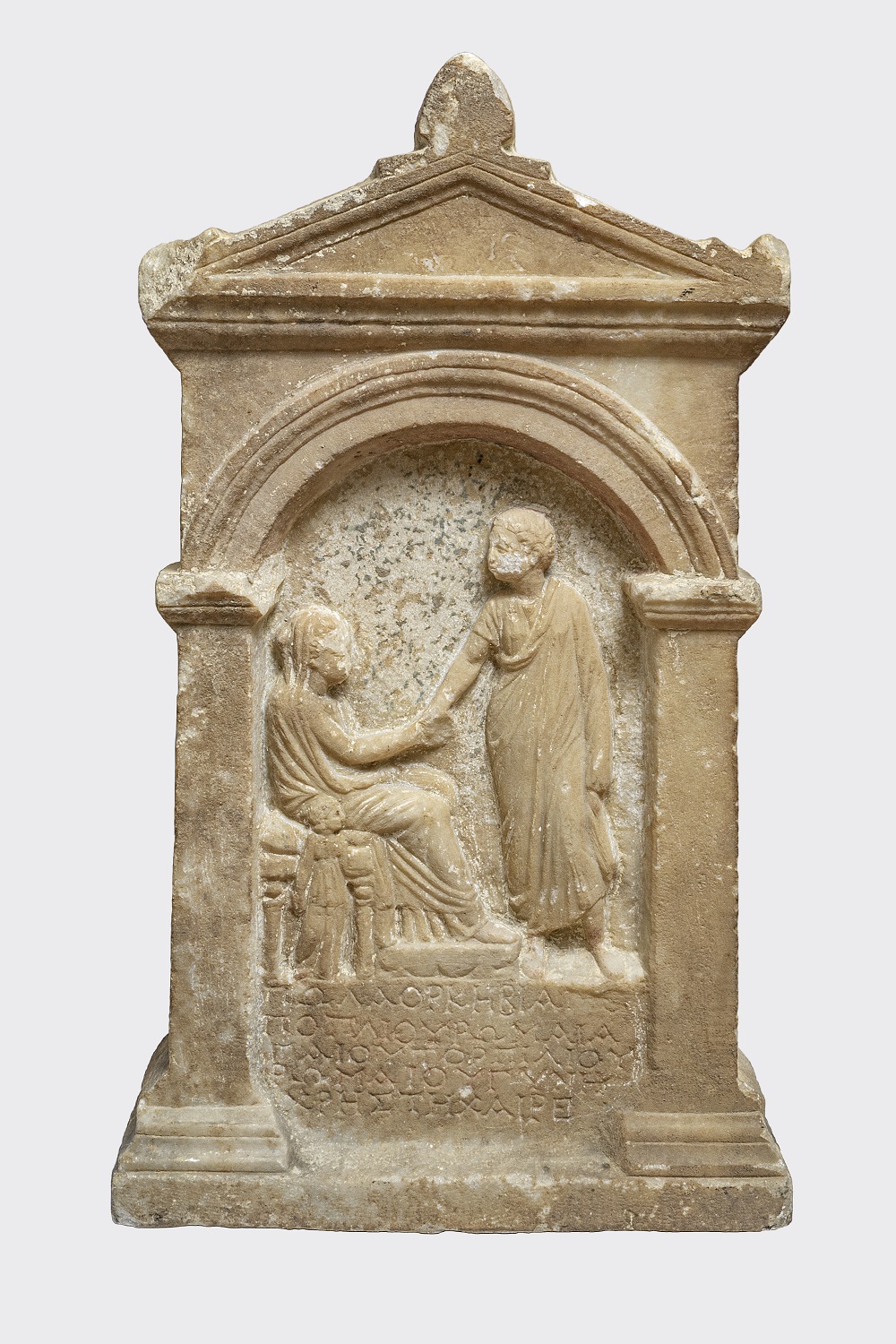 Stele funeraria a edicola in calcare decorata dal rilievo dei due defunti ritratti nell’atto di stringersi la mano per l’ultimo commiato. L’epitafio rappresenta la traduzione in greco dell’iscrizione sepolcrale della romana Pola Orcivia, moglie di Gaio Turpilio, morta probabilmente in un luogo abitato da persone parlanti greco. Solo così si spiegano sia la traduzione dell’iscrizione sia la specificazione della nazionalità romana di entrambe le persone menzionate. D’altro lato anche le circostanze del ritrovamento e le caratteristiche stilistiche ed epigrafiche della stele potrebbero far pensare a un pezzo di collezionismo di provenienza medio orientale.