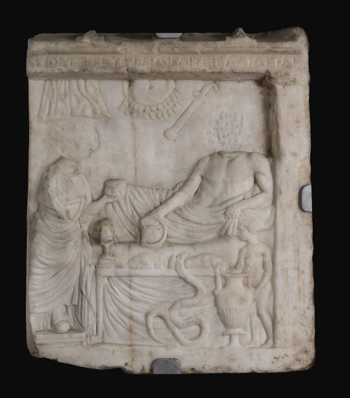 Porzione destra di stele a naiskos in marmo pentelico con sima e antefisse. Lateralmente il rilievo è inquadrato da pilastri piatti con capitello - che reggono un architrave - dei quali si conserva solo quello di destra. Il rilievo mostra l'eroe seminudo steso su una kline mentre regge con la destra una patera rilavorata con muso di pantera. Davanti alla kline, in piedi, si trova una donna di tre quarti con in mano due oggetti rilavorati, una maschera e un calice. Sia l'uomo che la donna sono acefali perché le teste sono state scalpellate. Sopra la kline, sullo sfondo, sono appesi una tunica, una corazza e una spada. Davanti al personaggio recumbente vi sono un serpente, un cratere a volute e un pais nudo. Le lettere presentano evidenti tracce di rilavorazione moderna, riscontrabili soprattutto nel sigma finale del nome del dedicante, nell’ eta dell’articolo divenuto epsilon e nel lamba di BASILEIA trasformato in A.