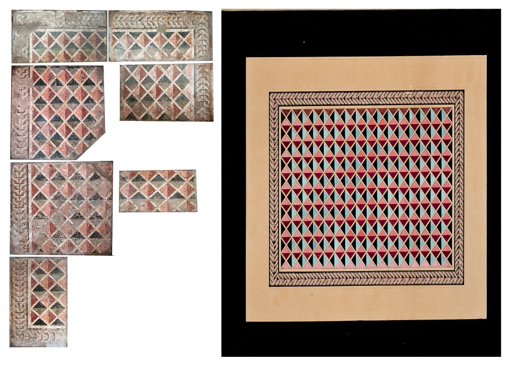 Pavimento in 7 pannelli della Prima fase edilizia, dall’ambiente di rappresentanza F che si apriva sul giardino. Pavimento mosaicato policromo con disegno a cancello di lavoro finissimo a tessere minute: in un reticolato bianco sono inseriti triangoli neri e verdi, rosso cupo e rosa chiaro; la cornice è a treccia a calice bianca su fondo nero, circondata da due fasce, bianca e nera.