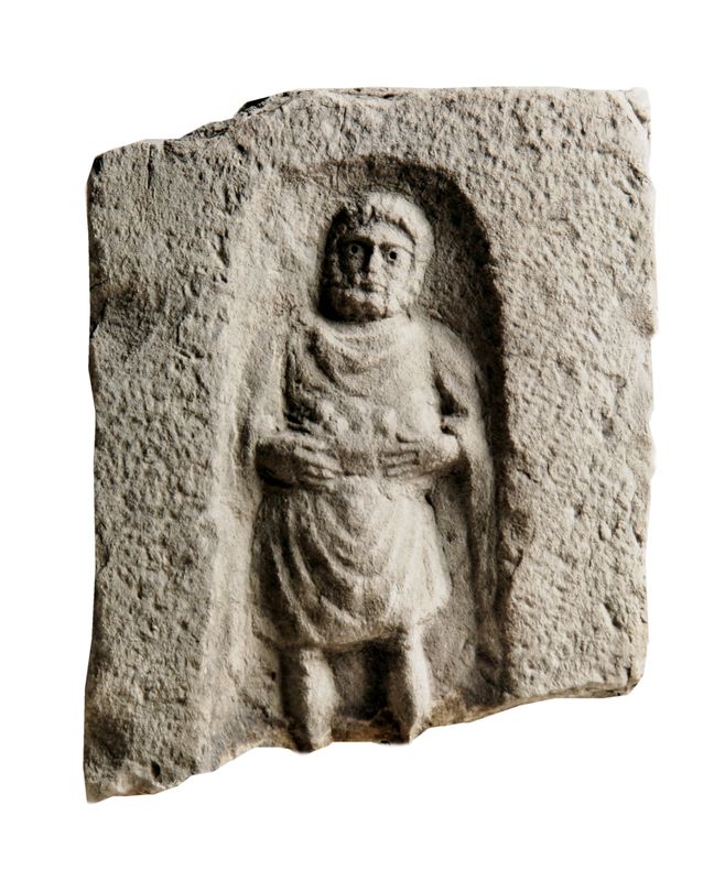 Blocco rettangolare scorniciato con rilievo figurato entro nicchia. Figura stante spezzata sotto le ginocchia, che sorregge davanti a se un'offerta di frutta in un contenitore circolare