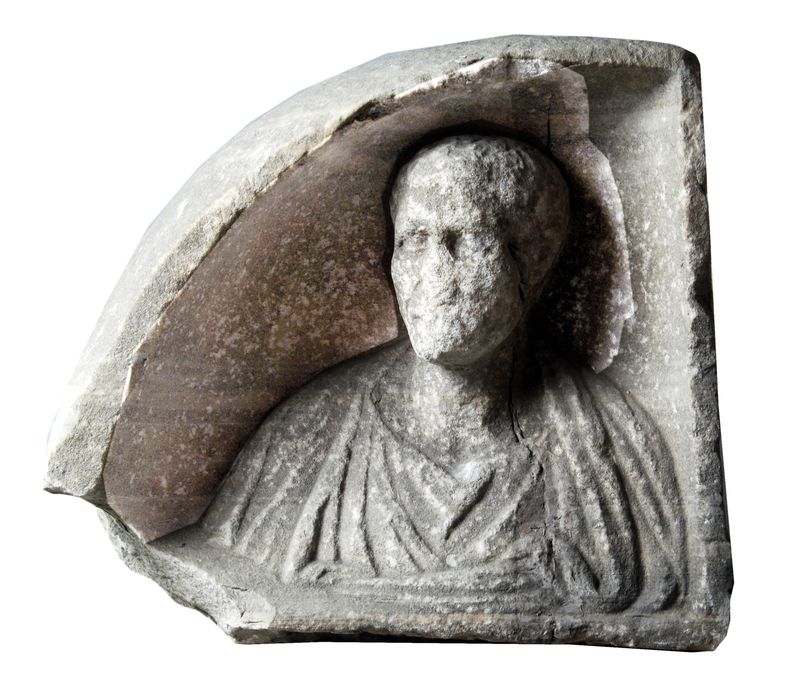 Angolo di coperchio a tetto di sarcofago a forma di acroterio con busto maschile che indossa tunica e mantello.
