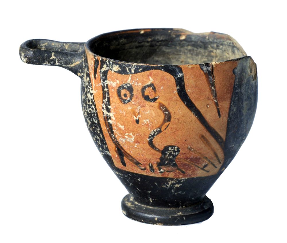 Skyphos apulo a figure rosse. Lato A e B: civetta tra foglie lanceolate.