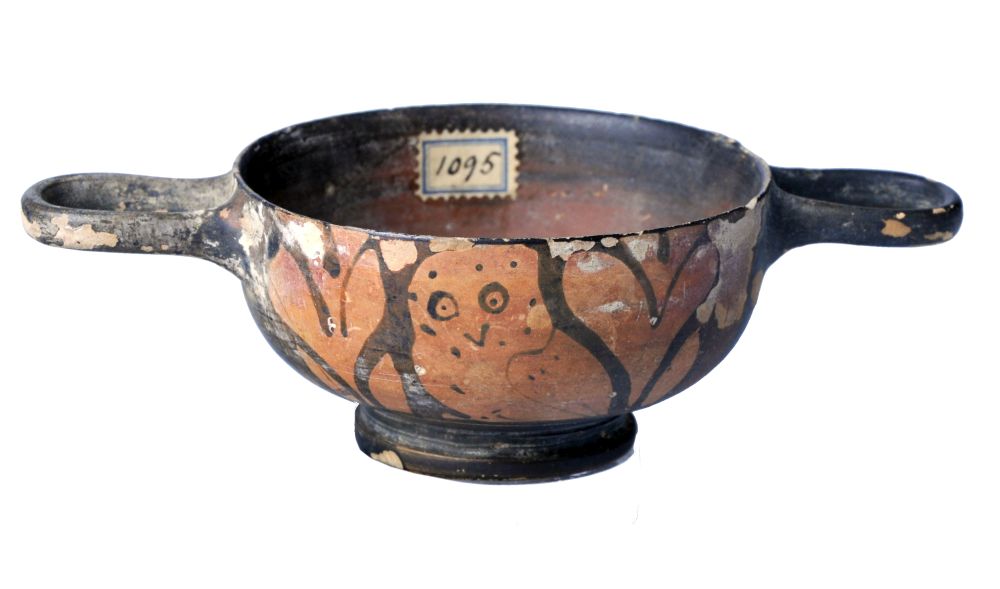 Kykux Skyphoide apula a figure rosse con anse a nastro orizzontali. Lato A e B: civetta tra foglie lanceolate.