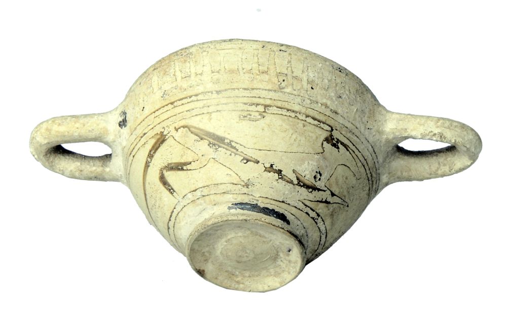 Skyphos miniaturistico corinzio a fasce con decorazioni figurate molto evanidi: due animali in corsa.