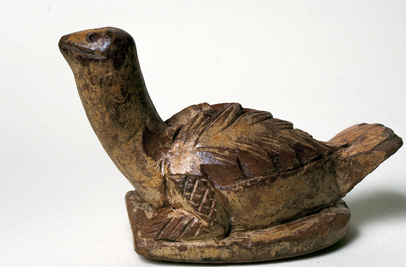 Su una base piana di forma ovale, tagliata orizzontalmente sul davanti, poggia una colomba ad ali chiuse, modellata in terracotta bruno rosata lavorata a stecca con abbondanti tracce del rivestimento bianco-ocra. Il piumaggio è reso con rilievo appena accennato e con incisioni a spina di pesce. Sul lungo collo la piccola testa ha occhi rotondi incavati e becco chiuso appena accennato. La coda a spatola e le grosse zampe, più simili a quelle di una tartaruga, piegate sotto il corpo dalla superficie segnata da un'incisione a reticolato. La figura è piena e la base presenta inferiormente incise una serie di linee parallele oblique intersecate da altre perpendicolari rese a trattini.