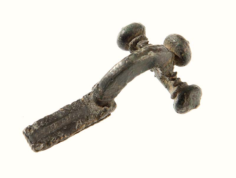Fibula con arco decorato a trattini obliqui e punti; la staffa presenta occhi di dado, tacche laterali e trattini obliqui; tracce dell'ageminatura;mancante dell'ago.