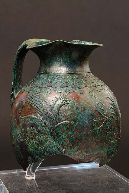 Oinochoe a bocca trilobata, corpo ovoidale, privo del piede e di gran parte del fondo. La decorazione alla Base del collo mostra kymation ionico con ovuli e dardi, sormontati da un listello a rilievo. Sulla spalla, un serto orizzontale ondulato con foglie d'edera cuoriformi appuntite. Sulla fronte del ventre una palmetta a 9 foglie nasce da un cespo d'acanto. Simmetricamente contrapposti, rivolti verso la palmetta, stanno due grifoni stanti, alati e crestati, con zampe e coda leonine, lunga testa dal becco adunco e barbula. Realizzata a parte e legata con saldatura a stagno (brasatura dolce), l'ansa è piena, a sezione triangolare, con attacco inferiore configurato a due mezze teste di cervo viste di profilo e affrontate. Circa la produzione, è stato proposto trattarsi di una delle più antiche elaborazioni tarantine sulla base di modelli attici, altri paralleli stilistici riconducono alle produzioni del Mar Nero.