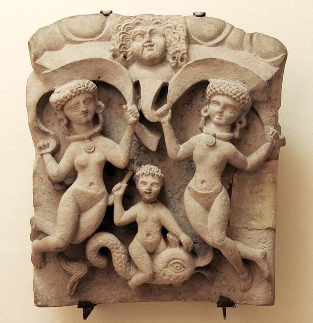 Frammento di altorilievo con due figure femminili nude, che nell'atto di danzare tengono un velo sopra la testa. Tra loro un amorino o erote cavalca un delfino; mentre nella cornice superiore ad ovuli, è inserito il volto della Gorgone. Il modellato morbido dei corpi, le proporzioni e i volti caratterizzati, ma impersonali, avvicinano questo pezzo alla scultura delle cappelle di Eracleopoli Magna (odierna Ehnasia El Medinet, nel Fayum). Questa scultura architettonica doveva decorare una nicchia, probabilmente di una cappella.