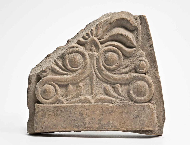 Argilla di color beige, in frattura argilla rosata. Una base in forte rilievo sostiene le doppie volute, dalle quali spunta la palmetta; l'elemento da cui si dipartono i petali è sostenuto da una specie di lungo stelo rigido. Presenta una spessa lastra alla base, le volute contengono un largo bottone, i petali sono piuttosto grossi e con nervatura centrale. Non si conosce l'esatta provenienza del pezzo.