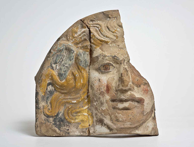 Ricomposto; Il viso è mancante della parte destra, occhio compreso, mentre una linea di frattura, che parte dal bordo superiore sinistro e lambisce la tempio e lo zigomo, divide l'antefissa in due pezzi ora riattaccati grazie ad un restauro.