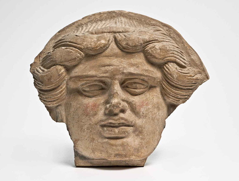 Argilla di color beige chiaro, in frattura di color beige, tracce di rosso sui capelli e di verde sulle serpi. Viso piuttosto largo e squadrato, ciocche dei capelli ben lavorate, occhi quasi socchiusi e palpebre molto sviluppate.