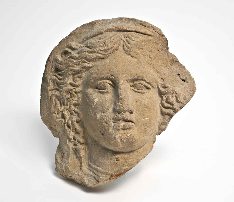 Argilla di color beige scuro, in frattura rosata. Il volto della donna è girato di tre quarti verso destra, gli occhi non hanno le pupille incise, sul collo ci sono due solchi paralleli e non tanto profondi; sul capo un diadema, dal quale fuoriescono ciocche di capelli che coprono le orecchie. Presenta dei pendenti e una collana con mezzaluna.