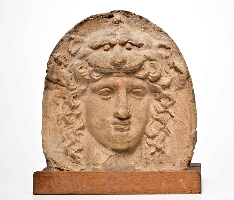 Argilla rosata sia in superficie che in frattura. Probabilmente prodotta dalla matrice creata usando come patrice l'antefissa inv. 3784 (T.491). Il volto, forse femminile, è girato verso destra e presenta un naso piuttosto massiccio, con una bocca piccola e carnosa; gli occhi, quasi chiusi, hanno palpebre spesse e sporgenti. La leonté è abbastanza ampia, mentre le alette sono piccole. Le ciocche dei capelli sono scomposte. .