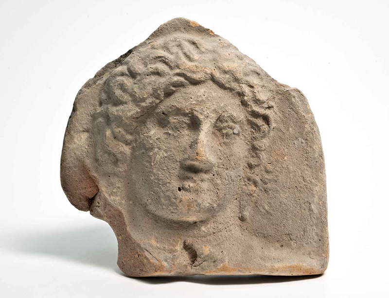 Argilla di color beige scuro, in frattura argilla rossastra. I particolari anatomici risultano difficilmente leggibili a causa della superficie consumata. Ha volto girato di tre quarti verso destra ed è tondeggiante, ha labbra piccole e carnose, capelli corti a ciocche, pendenti alle orecchie e collana con mezzaluna al collo.