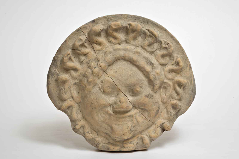 Argilla di color beige, antefissa di forma circolare. Mancante in basso a destra e a sinistra, molto rovinata in superficie. Il coppo corre lungo il bordo superiore ed arriva fino a metà lastra. La testa è circondata da una corona di serpentelli; i capelli formano due file di chioccioline sulla fronte; gli occhi sono allungati ed obliqui; la bocca arcuata e spalancata mostra lingua, zanne e denti.