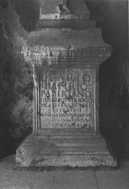 Blocco unico; Dado liscio; Lati incorniciati; Fronte incorniciata e iscritta; Coronamento modanato; Pulvino liscio; Baseo modanata. Proveniente ignota; Rinvenuto prsso la Cattedrale di San Giusto (campanile); Conservato presso l'Orto Lapidario, IV ripiano, risiede oggi nel Lapidario Tergestino, Castello di San Giusto.