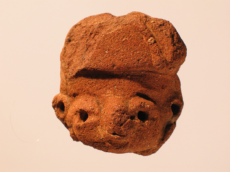 Miniatura fittile di una testa umana di stile Usulután modellata con impasto di argilla rossa. I tratti del volto sono interpretati in modo sommario ma efficace. La parte inferiore del viso è danneggiata perciò alcuni elementi emergono con maggior forza: i cerchi forati degli occhi e delle orecchie. Il naso è una protuberanza indistinta. La testa è sormontata da un copricapo a turbante ornato con nastri che ricadono sul davanti. Probabilmente faceva parte di una figurina intera la cui produzione è molto frequente nella ceramica Usulután.
