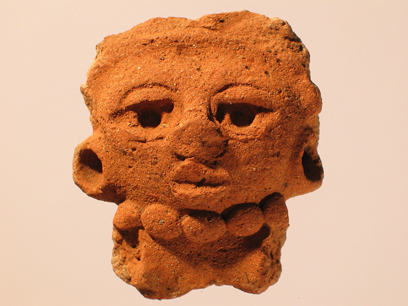 Frammento di figurina di stile Usulután consistente in una testa umana con parte del torace. È realizzata in terracotta rosata, modellata a mano. Alcuni dettagli sono resi con la tecnica del pastillage: la vistosa collana composta da cinque elementi, la bocca, gli occhi. Ampio rilievo è dato agli orecchini circolari sui lobi. Questi appaiono molto sporgenti e con un largo foro centrale piuttosto profondo. La testa è piatta così come il retro della figura. La fronte è separata dal copricapo da una striscia orizzontale più sporgente. La superficie ha un aspetto ruvido.