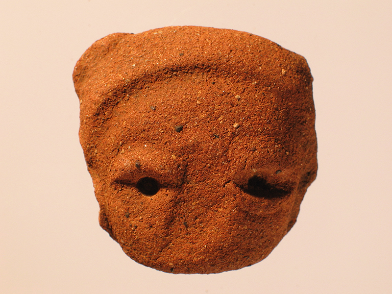 Testina umana di stile Usulután in miniatura appena abbozzata in un blocco di argilla. La superficie è ruvida e mostra la presenza degli elementi sgrassanti nell’impasto. Dei tratti somatici si distinguono appena gli occhi, resi con una leggera scanalatura e un foro per l’iride. Dalla testa si distacca una fascia liscia che avvolge la fronte e la nuca e che dietro appare in rilievo.
