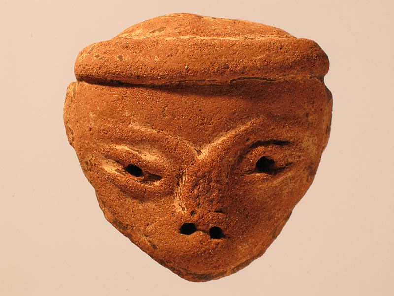 Rappresentazione schematica, di stile Usulután, di un volto umano realizzato in terracotta rossa. Il viso, di forma triangolare, è quasi piatto. Su questo sono ben delineate le due arcate sopracciliari; gli occhi mostrano un foro centrale al posto dell’iride e palpebre sporgenti. Poco sotto al naso si notano due fori ravvicinati. La bocca non è definita. La fronte è cinta da una fascia orizzontale in rilievo. Sono ancora presenti, specie nelle scanalature, tracce di pittura bianca e nera. Nella parte posteriore della testa è presente un largo intacco.