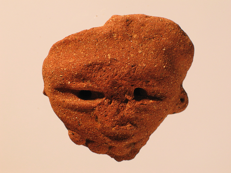 Piccola testa umana dal volto triangolare di stile Usulután, modellata in terracotta rossa non ingobbiata. La figura è priva di alcuni frammenti tra i quali il naso che appare mozzato dall’attaccatura, un orecchio e la parte sinistra della fronte. Da qui è possibile vedere che la testa era in parte cava all’interno. Il personaggio sfoggiava una collana a grosse perle sferiche e un copricapo. Gli occhi sono forati, mentre la fronte appiattita allude probabilmente alla pratica della deformazione cranica che spesso simboleggiava uno status sociale elevato.