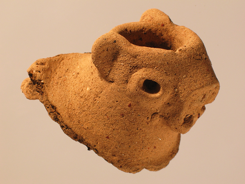 Frammento di vaso di stile Usulután consistente in un versatoio (o collo) sul quale è rappresentata una testa di animale. L’argilla dell’impasto è di colore beige rosato con presenza di ingobbiatura crema. Il collo è pressoché cilindrico. Il muso, sporgente dell’animale, è spezzato; gli occhi sono resi con due fori circolari collocati ai due lati della testa. Le orecchie sono piccole, semicircolari, inclinate verso la parte posteriore. In alto si apre l’imboccatura del versatoio che è rifinita con orlo arrotondato.