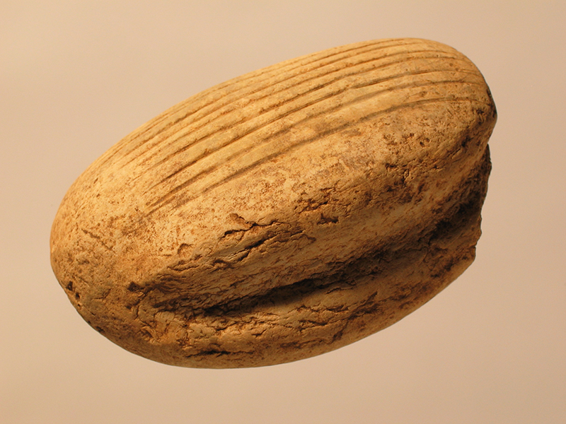 Pestello (a mano) di stile Usulután utilizzato per macinare le granaglie sulla pietra da macina. È ricavato da un grosso ciottolo di pietra bianca di forma ellittica. La superficie è ben levigata. Nella parte superiore, attraverso l’asportazione di una porzione della pietra, è stata creata un’ampia cavità che permette di poggiare comodamente il palmo della mano garantendo una presa ergonomica dello strumento e ottimizzandone la funzionalità. Sui lati sono praticate due scanalature orizzontali. La faccia inferiore è solcata da una serie di linee parallele incise per quasi tutta la lunghezza. Anche questo accorgimento era volto a migliorare la funzionalità dello strumento. Le pietre da macina, dette metates, potevano differire per dimensioni e decorazione, di solito geometrica o zoomorfa. I pestelli o manos potevano essere a forma di rullo o anche di staffa. Quelli del primo tipo sono diffusi nell’area di influenza mesoamericana, i secondi derivano da influenze sudamericane.