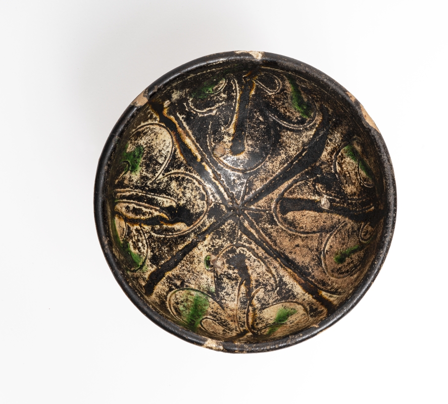 Ciotola emisferica con piccolo piede a tacco. Con all'interno decoro quadripartito inciso e dipinto in nero e verdea motivo vegetale con foglia centrale verticale e due laterali ricurve; all'esterno gocciolature sull'ingobbio chiaro che copre l'intera superficie.