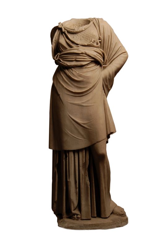 La figura è priva della testa e del braccio destro che erano lavorati a parte e poi inseriti negli appositi incassi, dalla superficie accuratamente scalpellata. La figura della dea, che indossa corazza con lungo chitone e himation o mantello, è raffigurata stante, con il peso portato sulla gamba destra e la sinistra piegata e flessa indietro. Ha il braccio sinistro piegato con il dorso della mano poggiante sul fianco e doveva avere la testa, coperta da elmo corinzio, rivolta verso la propria sinistra e il braccio destro - che nelle copie di questo tipo è restaurato come sollevato in atto di reggere l'asta - abbassato e disteso lungo il corpo. Il panneggio del chitone ricade in pesanti e profonde pieghe mentre il manto avvolge la figura con la stoffa tesa formante alcune pieghe. La corazza è decorata da piccole squame in rilievo e da serpentelli guizzanti. Anche posteriormente la statua è lavorata, ma con minor cura e resa dei particolari. "La statua di Trieste si può ricondurre a un tipo di Atena noto convenzionalmente come Vescovali. Il tipo è stato datato alla seconda metà del IV secolo a.C. ed attribuito spesso a Prassitele o alla sua scuola. Secondo altri studiosi, invece, il ritmo che domina la figura non sembra essere caratterizzato dall'armonia e dalla flessuosità dei ritmi prassitelici, ma si può piuttosto avvicinare ad un ambiente peloponnesiaco, con una datazione al secondo o al terzo decennio del IV secolo". "Inoltre, nonostante una certa durezza di esecuzione e nonostante le semplificazioni nella resa del panneggio, questa è l'opera, tra quelle provenienti dal teatro romano, che presenta la lavorazione più accurata. I forti effetti chiaroscurali creati dalle pieghe inferiori del chitone e dai solchi del trapano visibili soprattutto nella parte superiore del corpo possono far datare l'esecuzione all'età flavia". L'inconsueta presenza della statua di Minerva all'interno dell'impianto decorativo del teatro triestino è stata interpretata dagli studiosi come un'eventuale "tradizione adriatica" del tipo, come suggeriscono un'Atena Vescovali rinvenuta nel teatro di Fermo e quelle di Nikopolis e di Apollonia in Illiria.