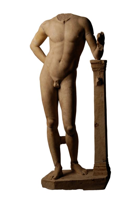La statua acefala, ricomposta con i dodici frammenti rinvenuti nell'iposcenio del teatro, raffigura un giovane nudo, stante, che si appoggia, in posizione di riposo, ad un pilastrino. Il peso del corpoinsiste sulla gamba destra tesa mentre la sinistra è leggermente piegata e portata all'indietro; il braccio sinistro che poggia con il gomito al pilastrino ha l'avambraccio sollevato e reggeva nella mano un oggetto, andato perduto, di difficile interpretazione; il braccio destro, portato indietro, è piegato e poggia con il polso al gluteo. La testa, non rinvenuta, era con ogni evidenza voltata verso la sua sinistra con lo sguardo abbassato verso l'oggetto tenuto in mano. Il pilastrino, a sezione quadrangolare, è semplicemente modanato e porta due segni dell'attaccatura di elementi decorativo-simbolici. La superficie del corpo, trattata in modo morbido, è accuratamente levigata nella parte anteriore, mentre quella posteriore è lasciata più grazza per un evidente inserimento della statua contro una parete o in una nicchia. "La proposta di riconoscervi Apollo... trova forse una giustificazione nelle forme giovanili del personaggio; ma non è escluso che si possa trattare di una figura mitica, quale Narciso o Giacinto, il giovinetto amato da Apollo". "La figura si appoggia al pilastrino secondo uno schema che potrebbe ricordare i ritmi prassitelici. Si deve tuttavia notare come la statua di Trieste non sia riconducibile a nessuno dei modelli statuari comunemente attribuiti allo scultore ateniese o alla sua scuola e, anzi, come essa sia in realtà caratterizzata da un ritmo meno abbandonato di quelli pressitelici, tale da far risultare le spalle quasi alla stessa altezza. Piuttosto l'opera sembra configurarsi come un lavoro eclettico, forse vicino a forme policletee: il motivo del braccio destro piegato e posato sulla schiena con il dorso della mano è analogo a quello del cosiddetto Narciso, appunto di ispirazione policletea, dove è anche presente un pilastro... ".