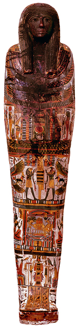 L'involucro per la mummia è fatto in cartonnage, un materiale ottenuto dalla sovrapposizione di strati di stoffa di lino (o di papiro) incollati e pressati, la cui superficie poi veniva stuccata con gesso e dipinta; accuratamente tagliato probabilmente tra la fine del XIX e l'inizio del XX secolo per esporre la mummia che era al suo interno, ha ora una parte anteriore e una parte posteriore, la quale composta da due pezzi simmetrici longitudinali, uniti originariamente da legacci di fibra naturale, priva di testo e di figure. La parte superiore, invece, è riccamente decorata: il volto presenta una singolare espressione di bellezza e perfezione di modellato, la parrucca è a due bande che ricadono sul petto e sul collare usekh. Sul vertice del capo è raffigurato uno scarabeo. Il volto e parte del petto sono coperti da una sostanza apparentemente bituminosa di colore scuro. Al di sotto del collare si sviluppano diversi registri decorativi sovrapposti: - La dea Nut ad ali spiegate, accompagnata da due brevi iscrizioni geroglifiche che recitano "Behdety dio grande"; - Al centro il falco Horo, con disco solare in capo e ali spiegate, regge in ambedue gli artigli il simbolo shen dell’eternità e ha un cobra sulle ali. Sopra le ali, su ciascun lato, tre divinità funerarie mummiformi in piedi: a sinistra Ra a testa di falco, Amseti con testa umana e Hapi a testa di babbuino (dietro vi è un falco sopra uno stendardo dell'Occidente); a destra Atum, Kebehsenuf a testa di falco e Duamutef con testa di sciacallo; dietro ancora un airone su uno stendardo. Restano tracce dei nomi delle divinità funerarie in geroglifico; - Al centro vi è il feticcio di Abido, col disco solare alla base della corona atef e un serpente ureo con la corona dell’Alto Egitto; è fiancheggiato a destra dal dio Thot a testa di ibis, dalla dea Uto dalla testa leonina e dal corpo di serpente munito di ali, e dal simbolo dell'Occidente; a sinistra dal dio Horo a testa di falco, di nuovo la dea Uto alata e stavolta lo scettro sekhem. Tra le ali della dea compare un ariete su stendardo; - La barca celeste Henu, al centro, è collocata entro un naos e presenta uguali caratteristiche rispetto a quella del coperchio. Adorano la barca due dee inginocchiate su un basso podio: a sinistra la dea Iside "signora dell’Occidente", inginocchiata, e a destra Nefti "sorella del dio, signora dell’Occidente"; - Al centro della scena si erge il pilastro djed, qui identificato con Osiride in quanto porta la corona ated, lo scettro e il flagello, oltre che la mantellina che ricopre di solito le spalle di Osiride. L'identificazione è garantita anche dalla breve iscrizione geroglifica, che recita "Osiride, signore dell'eternità". Il pilastro è affiancato a sinistra da un ibis su uno stendardo davanti ad un genio mummiforme a testa di coccodrillo accucciato su un piedistallo, a destra da un falco su stendardo e un genio mummiforme a testa di falco. Le due brevi iscrizioni alle estremità chiariscono l'azione rappresentata: "Fare protezione sull'Osiride (= il defunto)". - La zona centrale del rialzo dei piedi è occupata da un testo geroglifico distribuito su tre colonne. Ai lati di quest'ultima è raffigurato uno sciacallo accucciato in mezzo a segni riempitivi, e con due differenti iscrizioni che lo identificano: a sinistra "Upuaut meridionale, guida delle Due Terre, seguace dell’Enneade di Osiride", a destra "Upuaut settentrionale, guida del cielo, seguace dell’Enneade di Horo".
