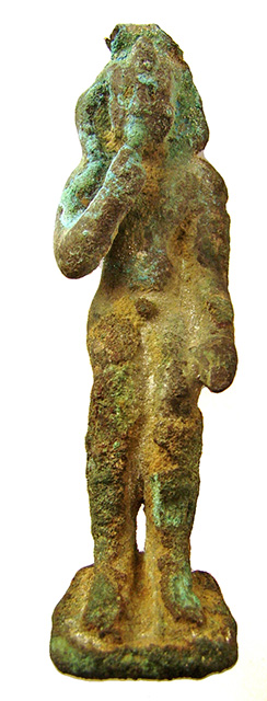 Bronzetto raffigurante il dio Arpocrate: il dio fanciullo è ritratto nudo, seduto. I tratti iconografici che lo contraddistinguono sono la treccia infantile che scende sul lato destro del capo e il braccio destro piegato per portare l’indice alla bocca. Il braccio sinistro è steso lungo il corpo, i piedi poggiano su una base quadrangolare. Sulla fronte è presente un ureo, mentre sul capo porta un nemes che forse era sormontato dal disco solare. Arpocrate è una divinità bambina il cui culto avrà molta fortuna nelle epoche finali della storia egiziana, ed è considerato figlio di Iside ed Osiride.