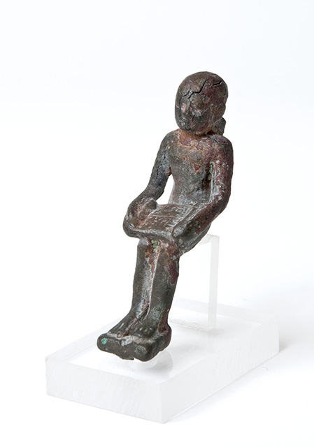 Piccola statuina in bronzo che raffigura Imhotep, un personaggio realmente esistito, ma che per le sue doti straordinarie fu in seguito divinizzato: si tratta del visir e gran sacerdote di Eliopoli che fu l’architetto della piramide a gradoni di Gioser. In quanto persona dall’enorme sapienza, divenne a partire dal Nuovo Regno patrono degli scrittori e personificazione della saggezza; venne definito inoltre come figlio di Ptah e identificato in epoca Tolemaica con il dio greco della medicina Asclepio. Come il dio suo padre, sul capo porta la calotta; il volto è senza barba. Indossa una collana a più giri e una lunga gonna. E' raffigurato seduto, con un rotolo di papiro tra le mani e sotto i piedi c'è una piccola base.